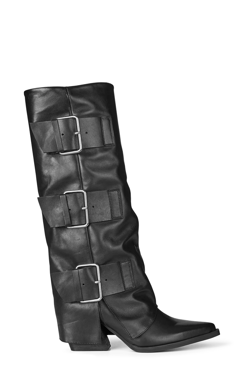 Bend Down -saapas on voimakkaan ilmeen omaava pitkävartinen kenkä, joka huokuu modernia asennetta. Valmistettu pehmeästä mustasta vasikannahasta ja viimeistelty kolmella leveällä remmillä sekä näyttävillä hopeisilla soljilla, tämä saapas ei jää huomaamatta.