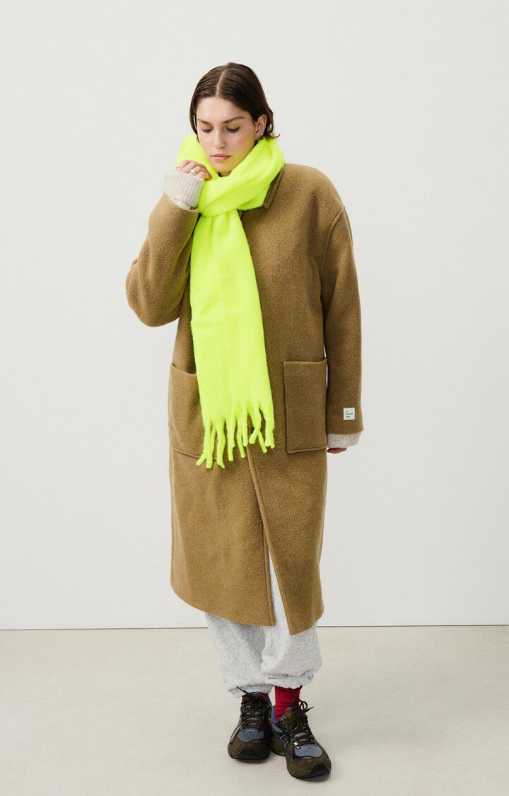 Pitkä, pehmeä huivi, jossa on paksu neulos ja hapsutetut päät. Lämmin ja näyttävä asuste, joka tuo väriä ja volyymia talvipukeutumiseen. Täydellinen lisä minimalistisiin takkeihin tai rentoon kerrospukeutumiseen.