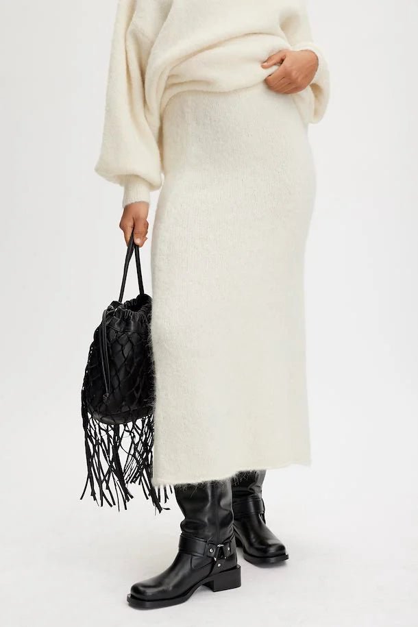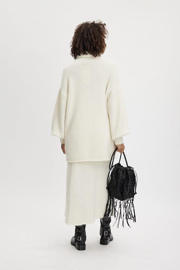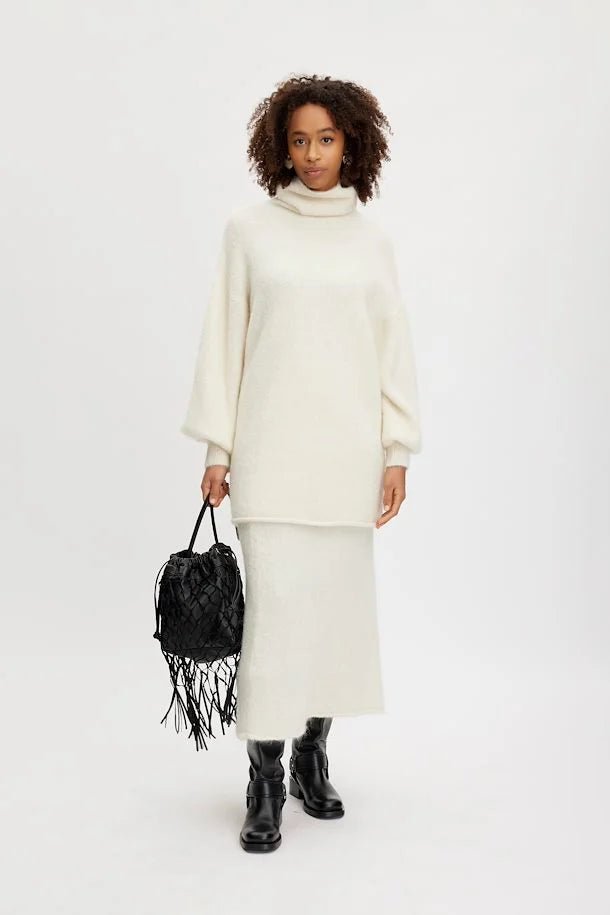 Helppo A-linjainen neulehame, midi pituus, on mukava ja lämpöinen vaatekappale. Pue muhkean PosiaGZ neuleen kanssa. Malli on 174cm ja yllä on koko S.
