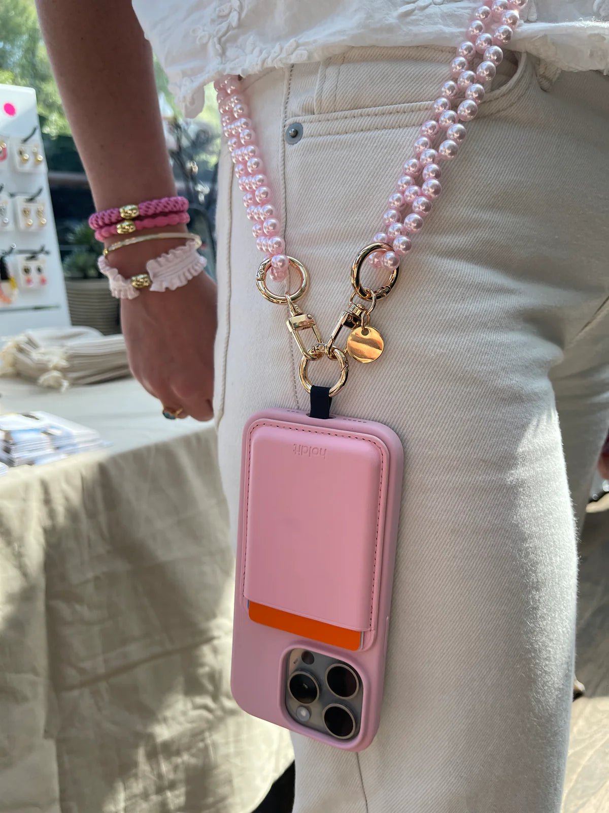 La Luna Pearl -puhelinhihna on elegantti ja hienostunut asuste, joka antaa puhelimellesi korumaisen ilmeen. Helmenhohtoiset vaaleanpunaiset akryylihelmet ja kullanväriset metalliosat tekevät hihnasta näyttävän mutta romanttisen kokonaisuuden.