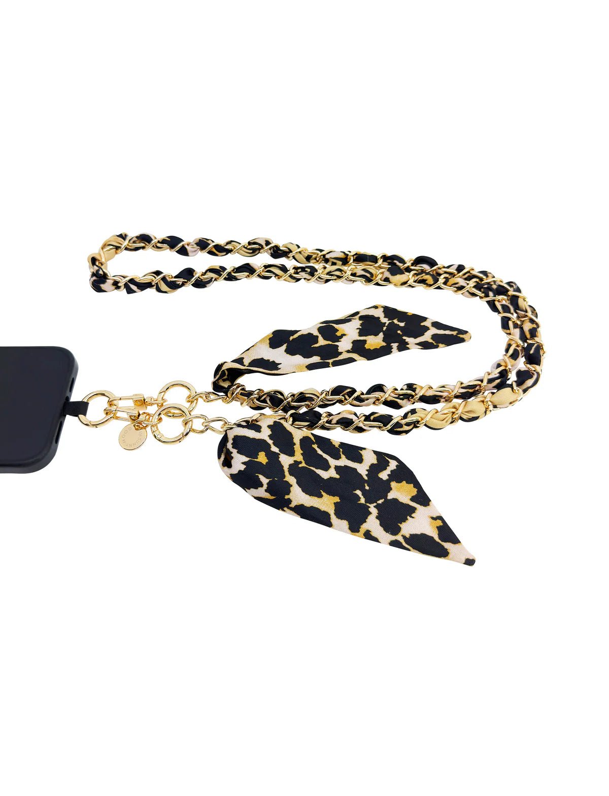 Tämä puhelinhihna yhdistää kullanhohtoisen ketjun ja näyttävän eläinkuviollisen viskoosikankaan moderniksi ja ylelliseksi kokonaisuudeksi. Pehmeä kangas on punottu osaksi ketjua ja jatkuu tyylikkäinä yksityiskohtina molemmissa päissä. Kangasta voi vetää esiin lisäpituutta varten. Hihna on mukava käyttää ja tuo asuun persoonallisen, trendikkään ilmeen.