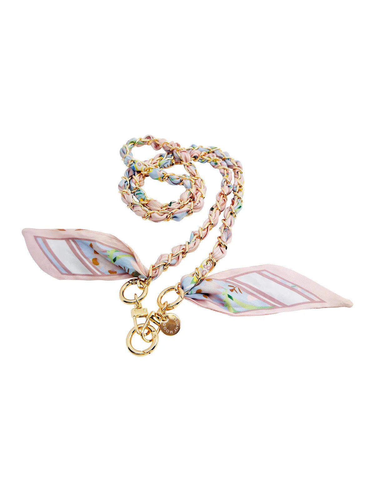 Tämä puhelinhihna yhdistää kullanhohtoisen ketjun ja hennon pastellisävyisen viskoosikankaan kevyeksi ja elegantiksi kokonaisuudeksi. Pehmeät vaaleanpunaisen sävyt ja hienovarainen kuviointi tuovat asusteeseen raikkaan ja naisellisen ilmeen. Kangas on punottu osaksi ketjua ja jatkuu kauniina yksityiskohtina molemmissa päissä. Halutessasi voit vetää kangasta esiin saadaksesi lisää pituutta.