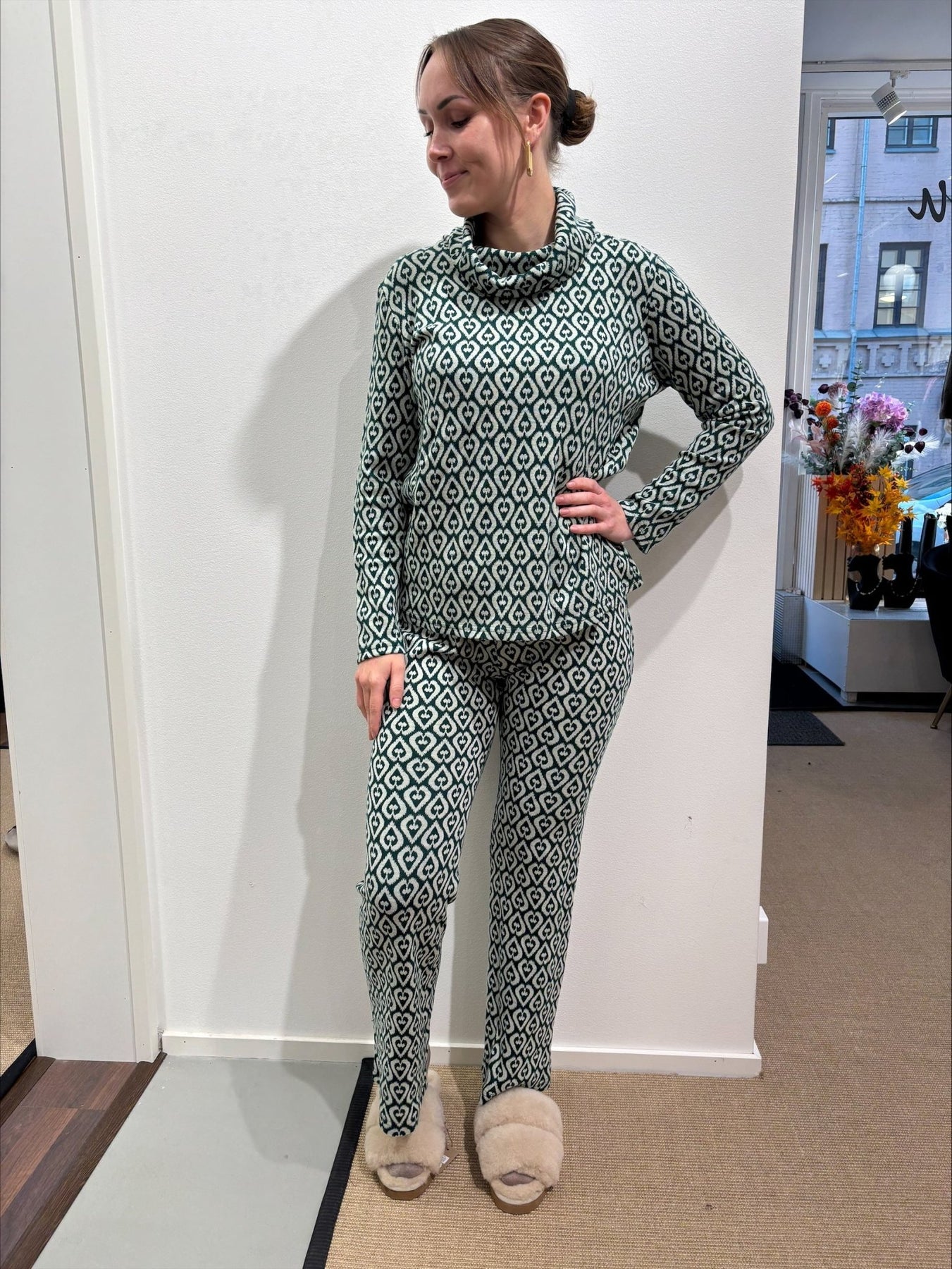Pehmeä ja lämmin merinovillainen setti, joka koostuu kuviollisesta pooloneuleesta ja yhteensopivista housuista. Tyylikkäässä vihreä-valkoisessa sydänkuosissa oleva asukokonaisuus on sekä mukava että näyttävä valinta arkeen tai vapaa-aikaan. Yläosassa on rento poolokaulus ja pitkät hihat. Housuissa on joustava vyötärö ja kapeahko istuvuus, joka tekee niistä miellyttävät käyttää.