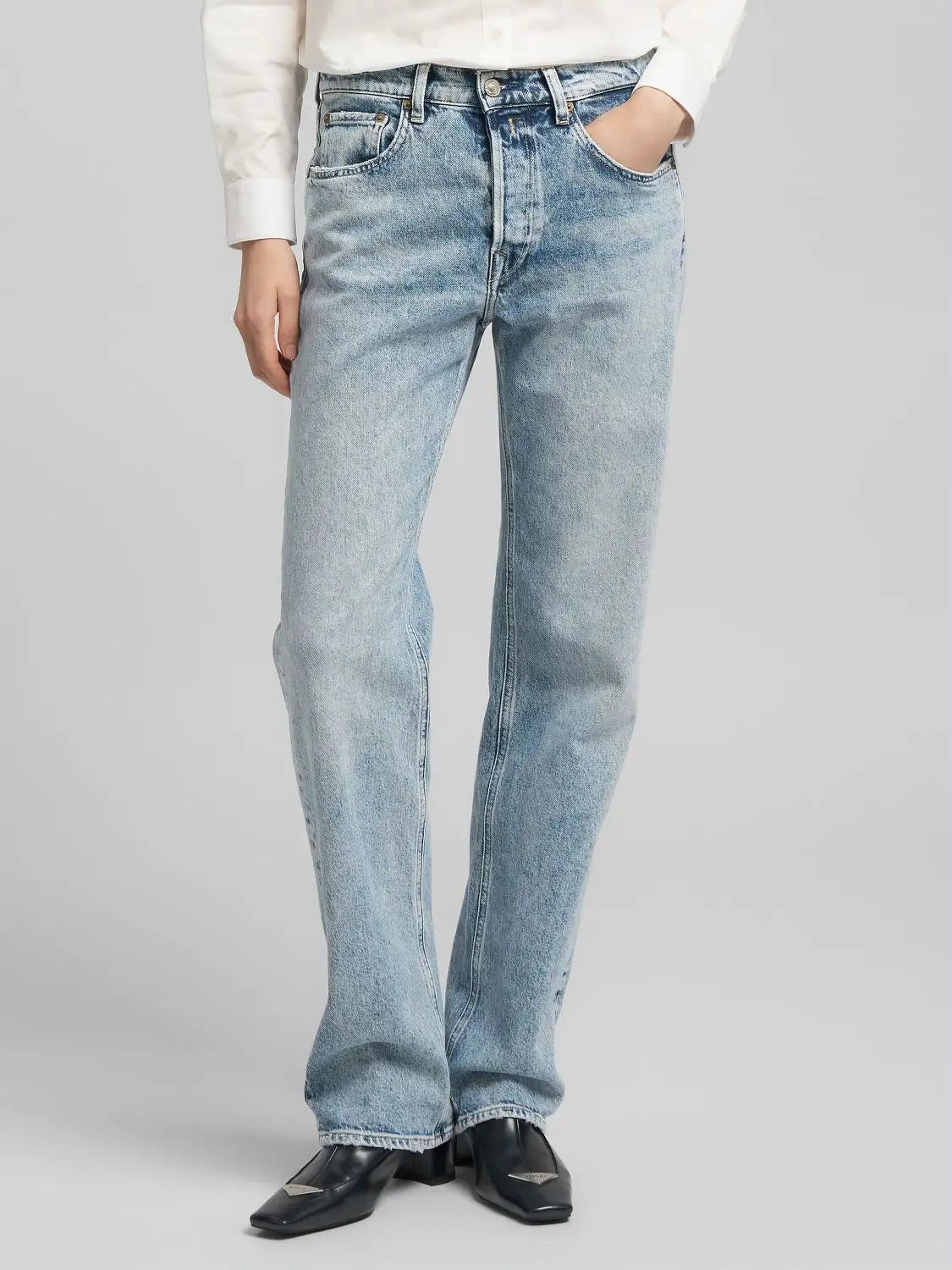 Rennot ja mukavat farkut, joissa on matala vyötärö ja suora lahje. Malli on niin sanottu "boyfit", eli se istuu väljemmin ja tuo rennon ilmeen pukeutumiseen.