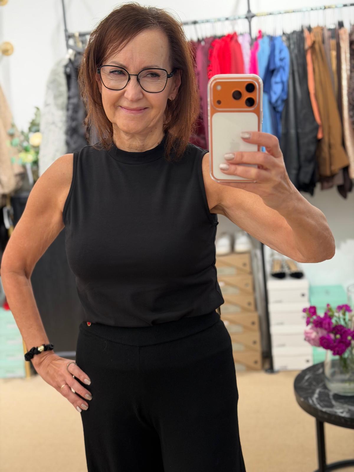 Tämä hihaton toppi on täydellinen valinta, kun kaipaat mukavuutta ja huoliteltua ilmettä samassa paketissa. Yksinkertaisen kaunis muotoilu, napakka mutta joustava materiaali sekä kevyt puolikorkea kaulus tekevät tästä topista monikäyttöisen vaatekaapin kulmakiven.