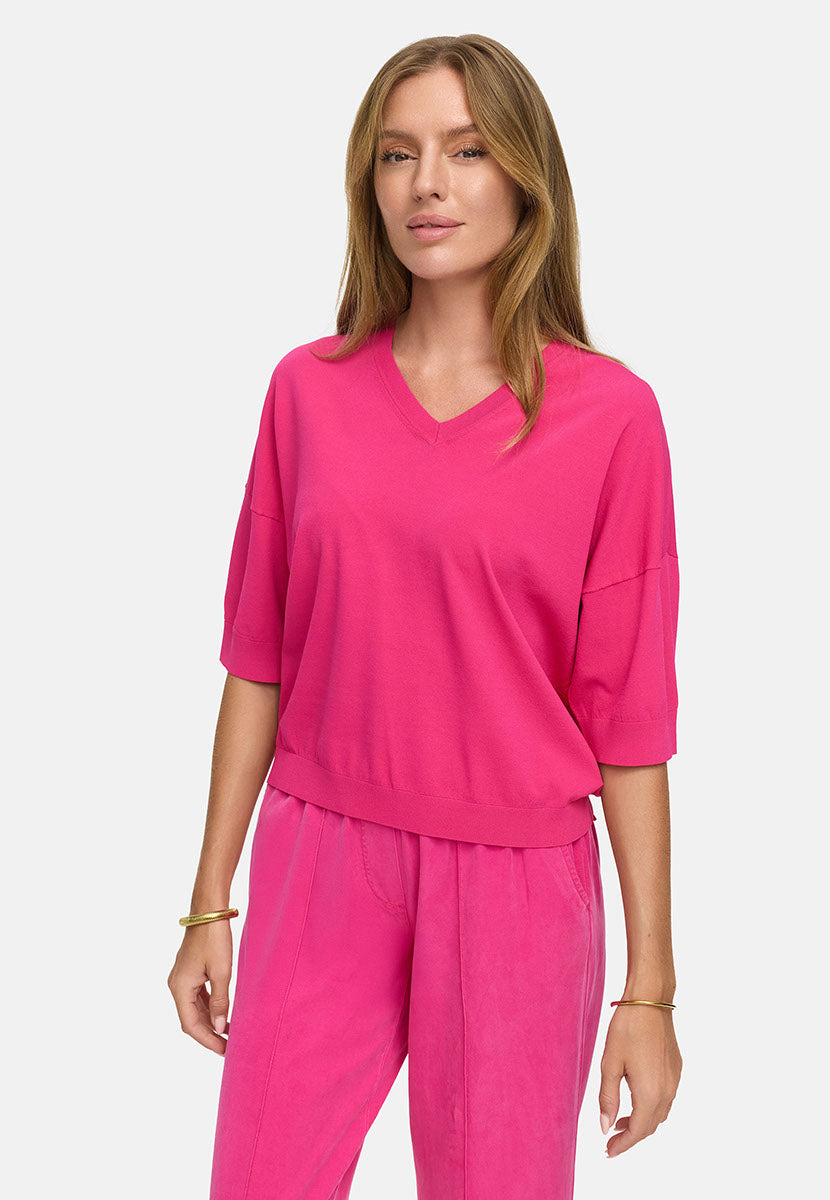 Tämä neulepaita tuo asuun raikasta väriä ja modernia rentoutta. Pehmeä viskoosisekoiteneulos tuntuu miellyttävältä ihoa vasten ja laskeutuu kauniisti.