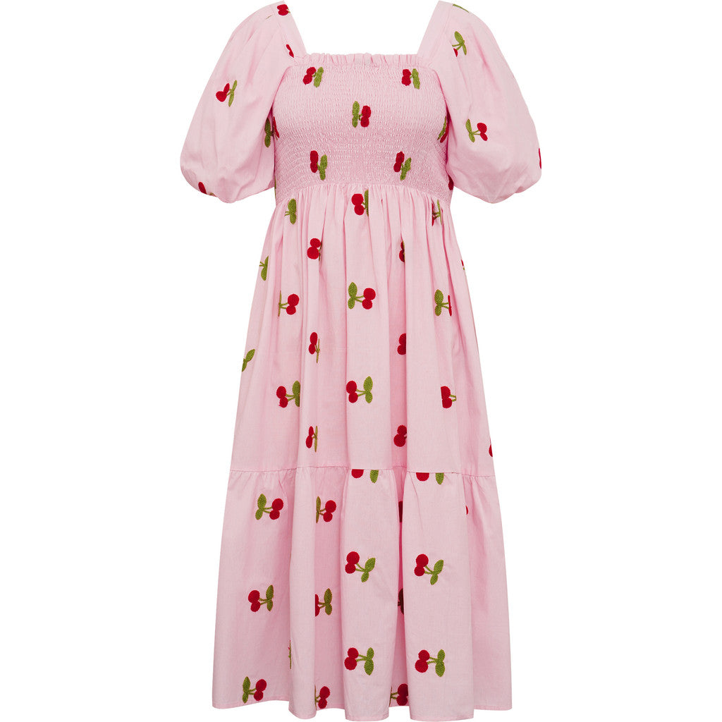 Cheri Fruit -mekko on hurmaava midi-pituinen kesämekko, jossa on leikkisä hedelmäprintti. Mekon rypytetty smokkirintamus tuo kauniisti istuvuutta, kun taas väljät, volyymikkaat hihat luovat romanttisen ja ilmavan ilmeen.