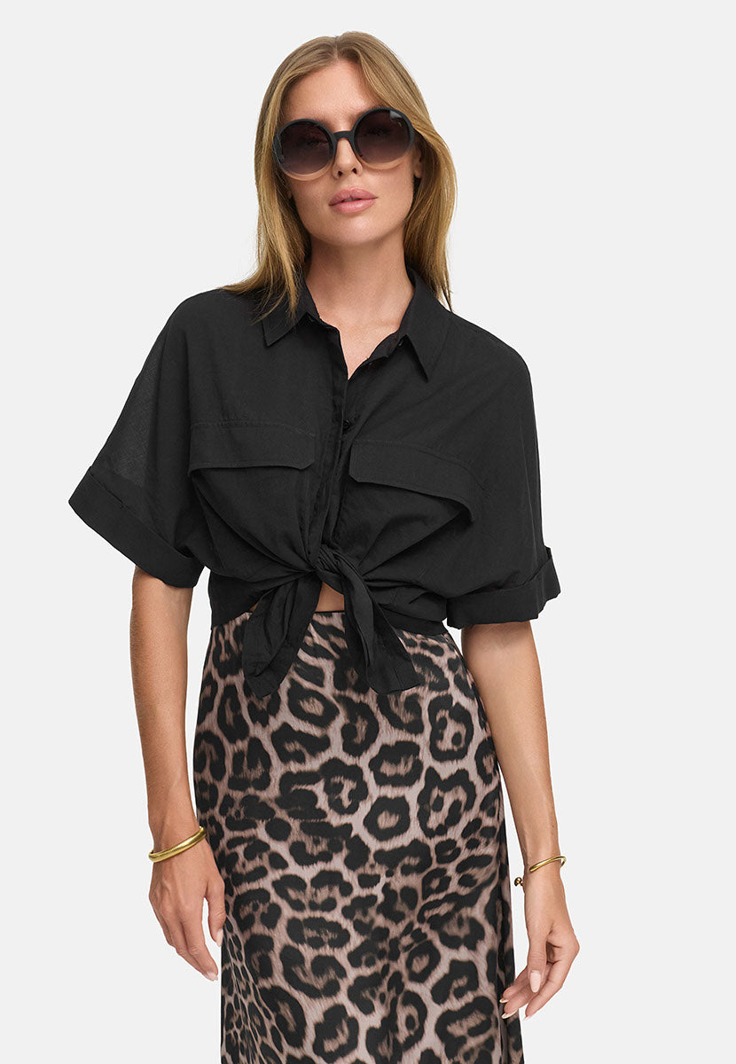 Lyhyet, väljät hihat ja rennosti laskeutuva malli tuovat modernia siluettia, kun taas kaulus ja nappilista luovat klassisen ilmeen. Rintataskut viimeistelevät puseron ajattoman tyylin. Helppo yhdistää niin printtihameeseen kuin suoralahkeisiin housuihin.