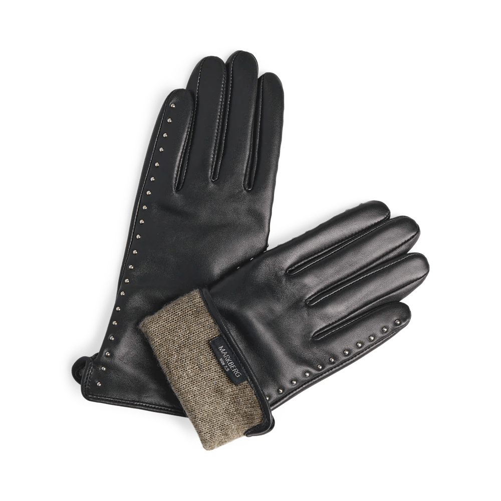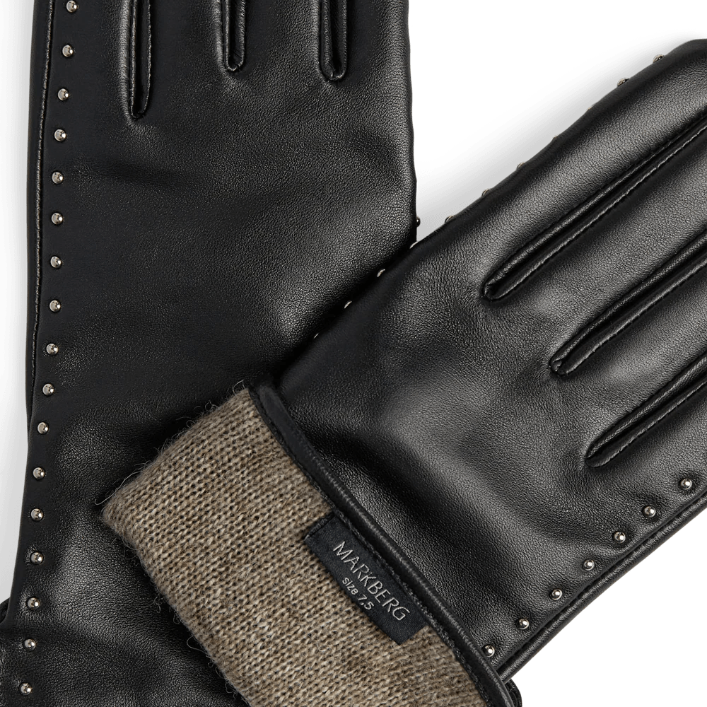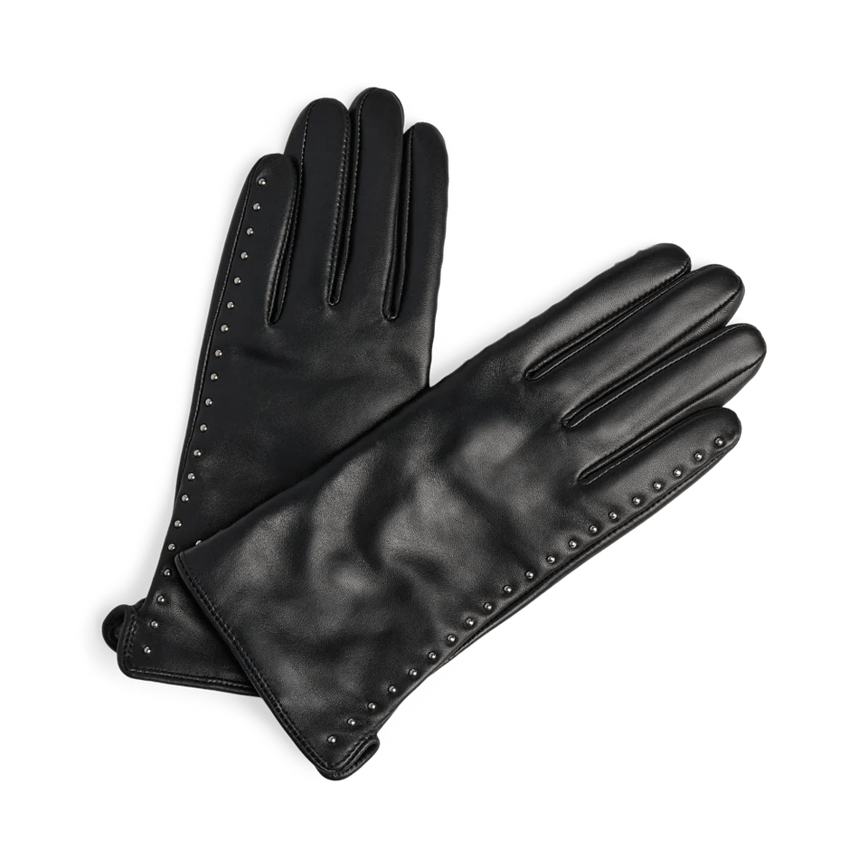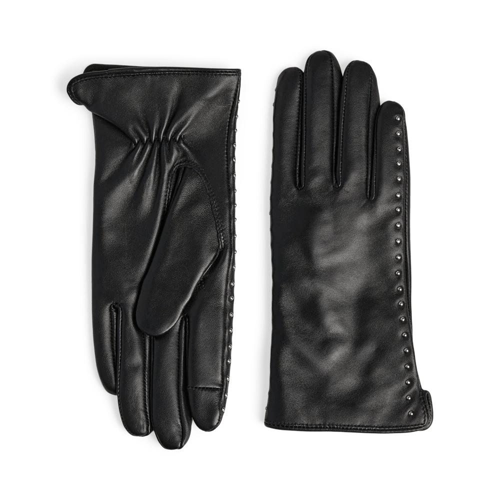 Ajattoman tyylikkäät mustat nahkahanskat, joissa on moderni siluetti ja hienostuneet niittiyksityiskohdat. Valmistettu pehmeästä ja kestävästä lampaan nahasta, joka istuu kauniisti ja mukautuu käteen.