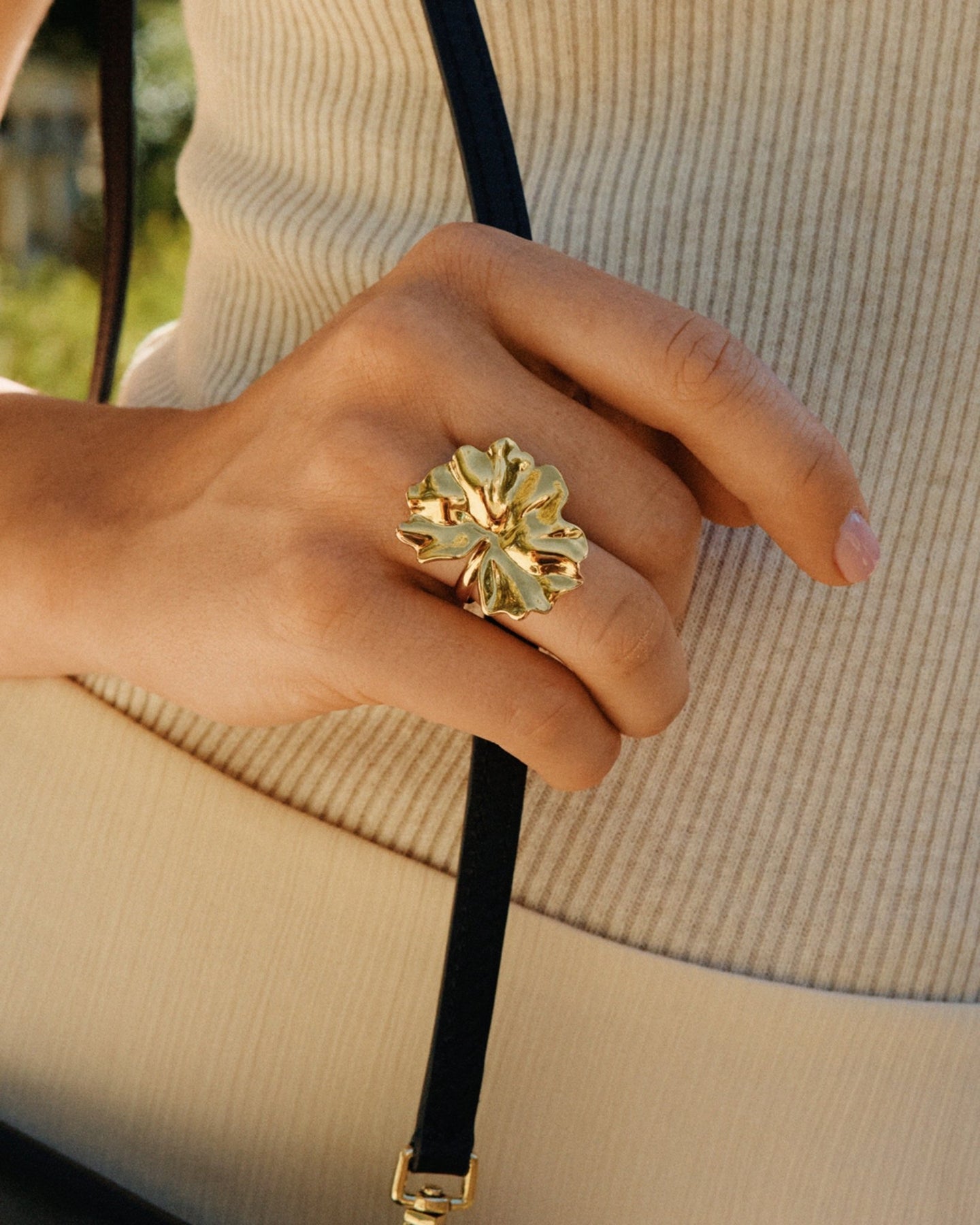 Gerana-sarjan ytimessä ovat suuret, aaltoilevat kukan terälehdet – luonnon kauneuden inspiroima muotokieli. Tässä näyttävässä sormuksessa 14 karaatin kultaus korostaa veistoksellista muotoa, jossa stilisoitu terälehti aukeaa elegantisti käden päälle. Ilmeikäs ja naisellinen koru, joka viimeistelee niin arkilookin kuin juhla-asun.