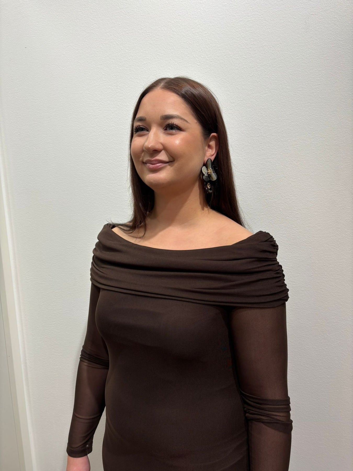 Off-shoulder-pääntie on kauniisti drapeerattu, mikä luo naisellisen ja sensuellin siluetin. Pitkät hihat lisäävät kontrastia ja tekevät mekosta täydellisen valinnan niin juhliin kuin illanviettoihin. Mekko on vartalonmyötäinen ja korostaa kauniisti kehon linjoja.