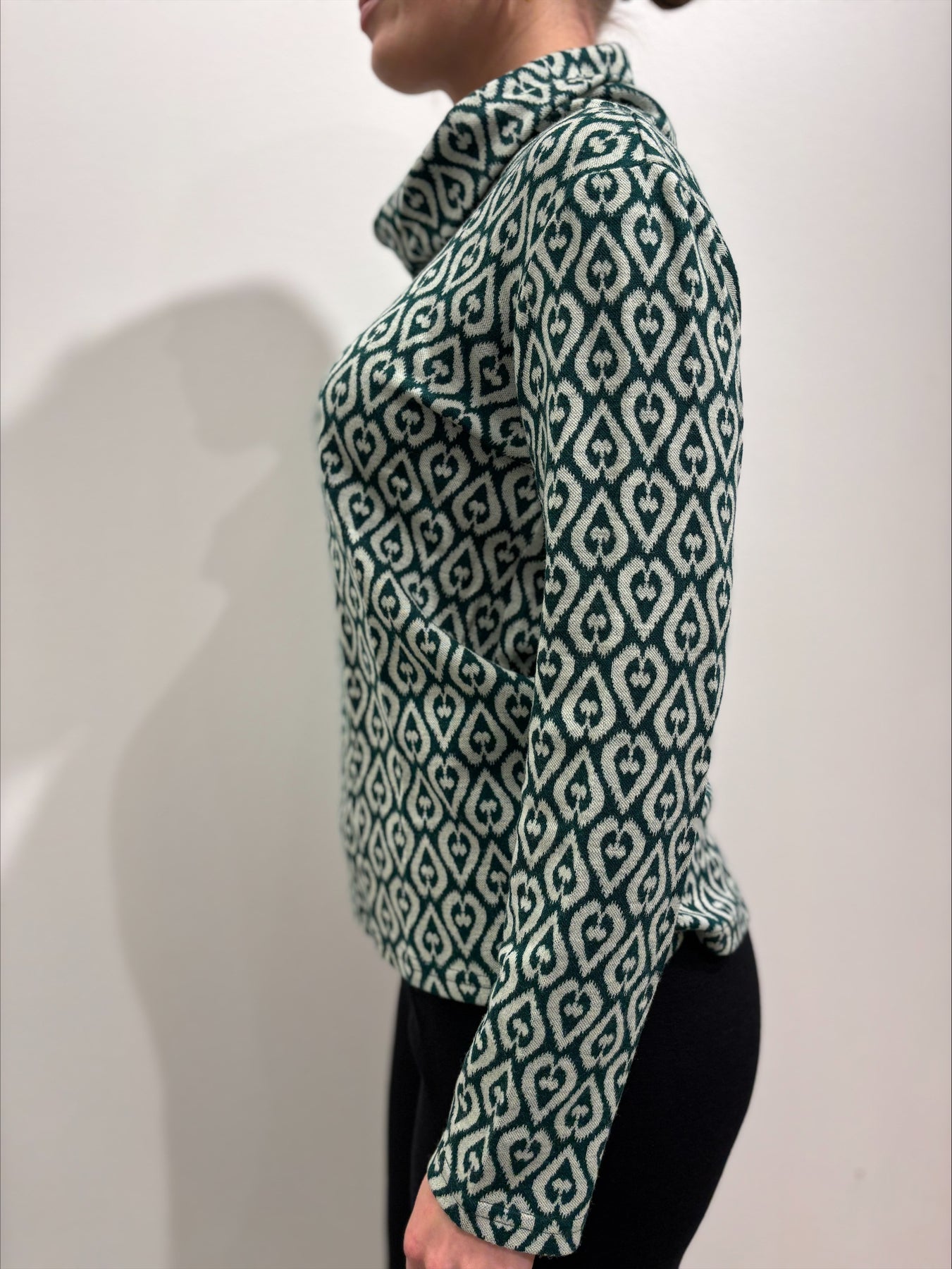 Pehmeä ja lämmin merinovillainen setti, joka koostuu kuviollisesta pooloneuleesta ja yhteensopivista housuista. Tyylikkäässä vihreä-valkoisessa sydänkuosissa oleva asukokonaisuus on sekä mukava että näyttävä valinta arkeen tai vapaa-aikaan. Yläosassa on rento poolokaulus ja pitkät hihat. Housuissa on joustava vyötärö ja kapeahko istuvuus, joka tekee niistä miellyttävät käyttää.