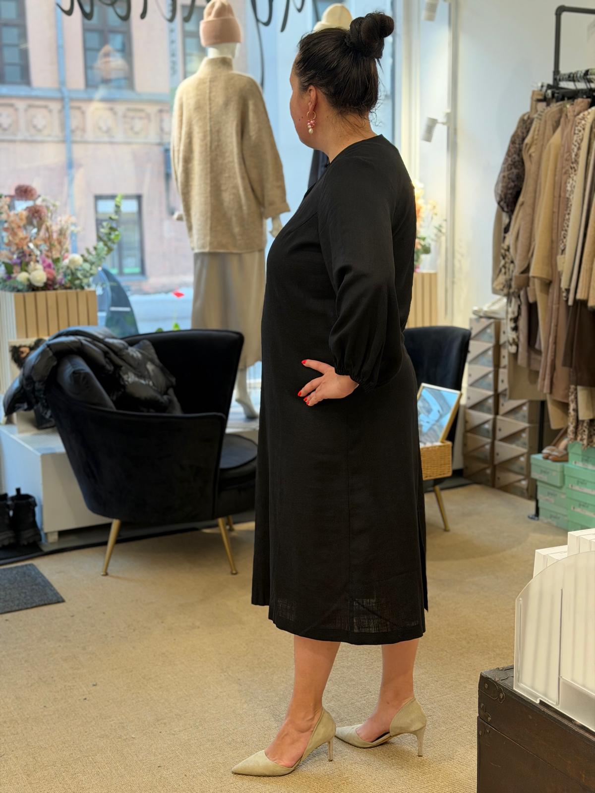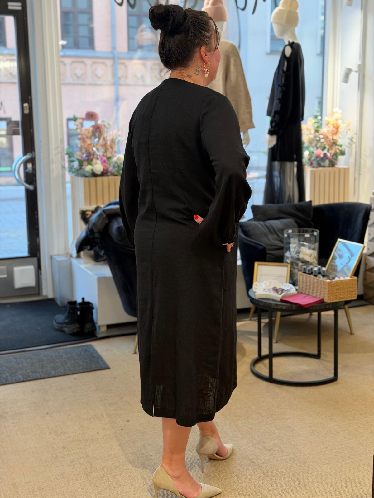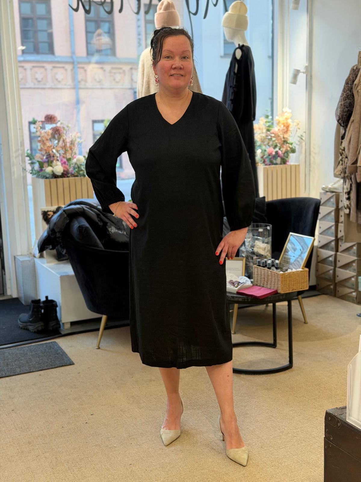 Materiaali on kauniisti laskeutuvaa, pehmeän hengittävää sekoitetta, joka tuntuu miellyttävältä ihoa vasten ja antaa juuri sopivasti rakennetta. Helma yltää pohkeeseen ja antaa ryhdikkään mutta rennon siluetin.