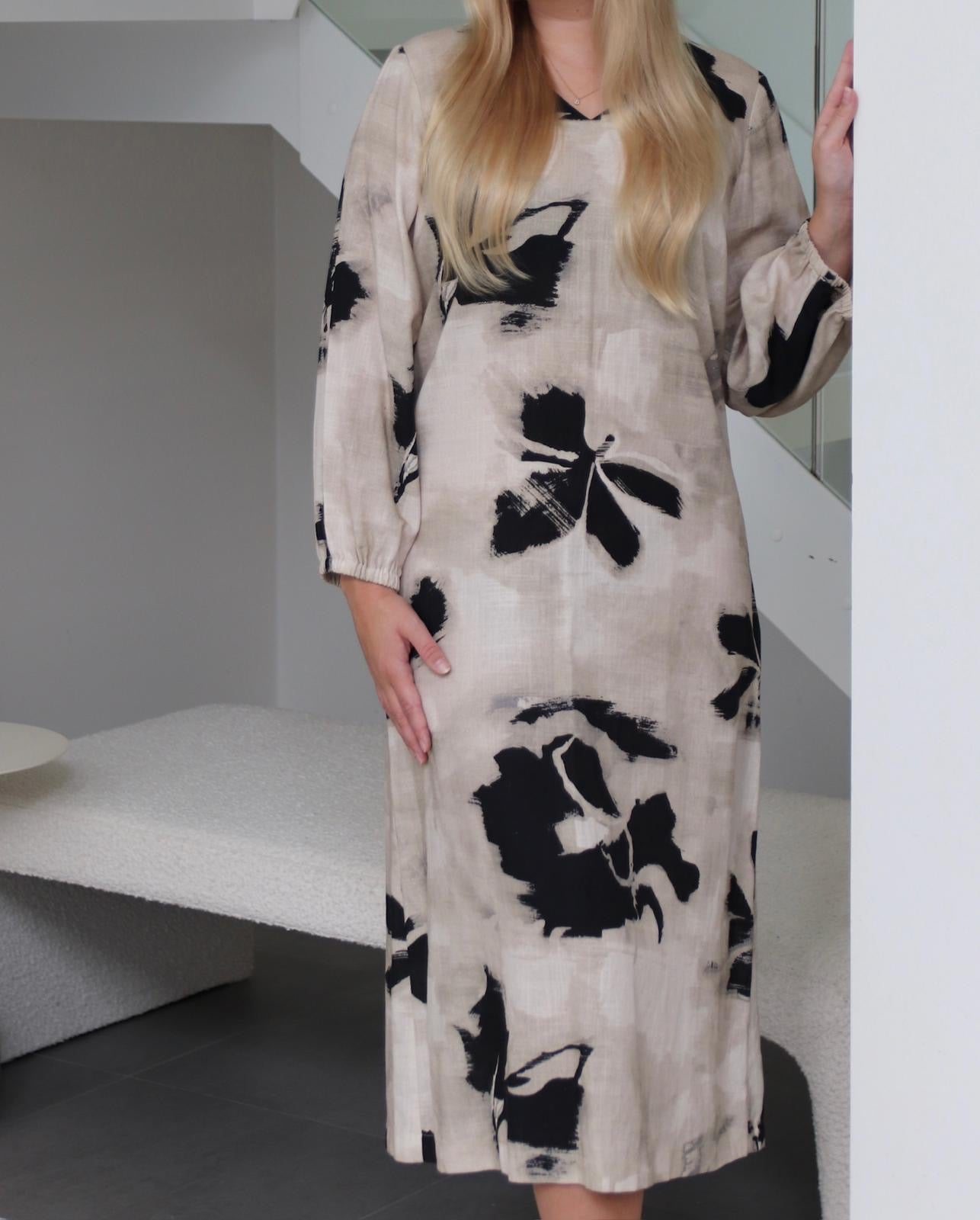 Tyylikäs ja ajaton maksimekko kevyestä viskoosi-pellavasekoitteesta. Väljä leikkaus, pitkät hihat ja kaunis V-pääntie tekevät mekosta mukavan ja helposti puettavan. Valmistajan Varjo-kuosi tuo kokonaisuuteen modernia ilmettä.