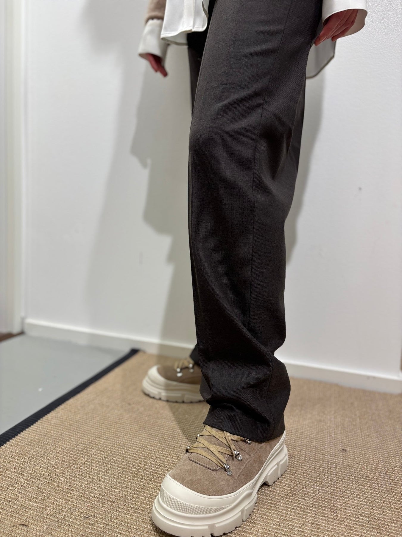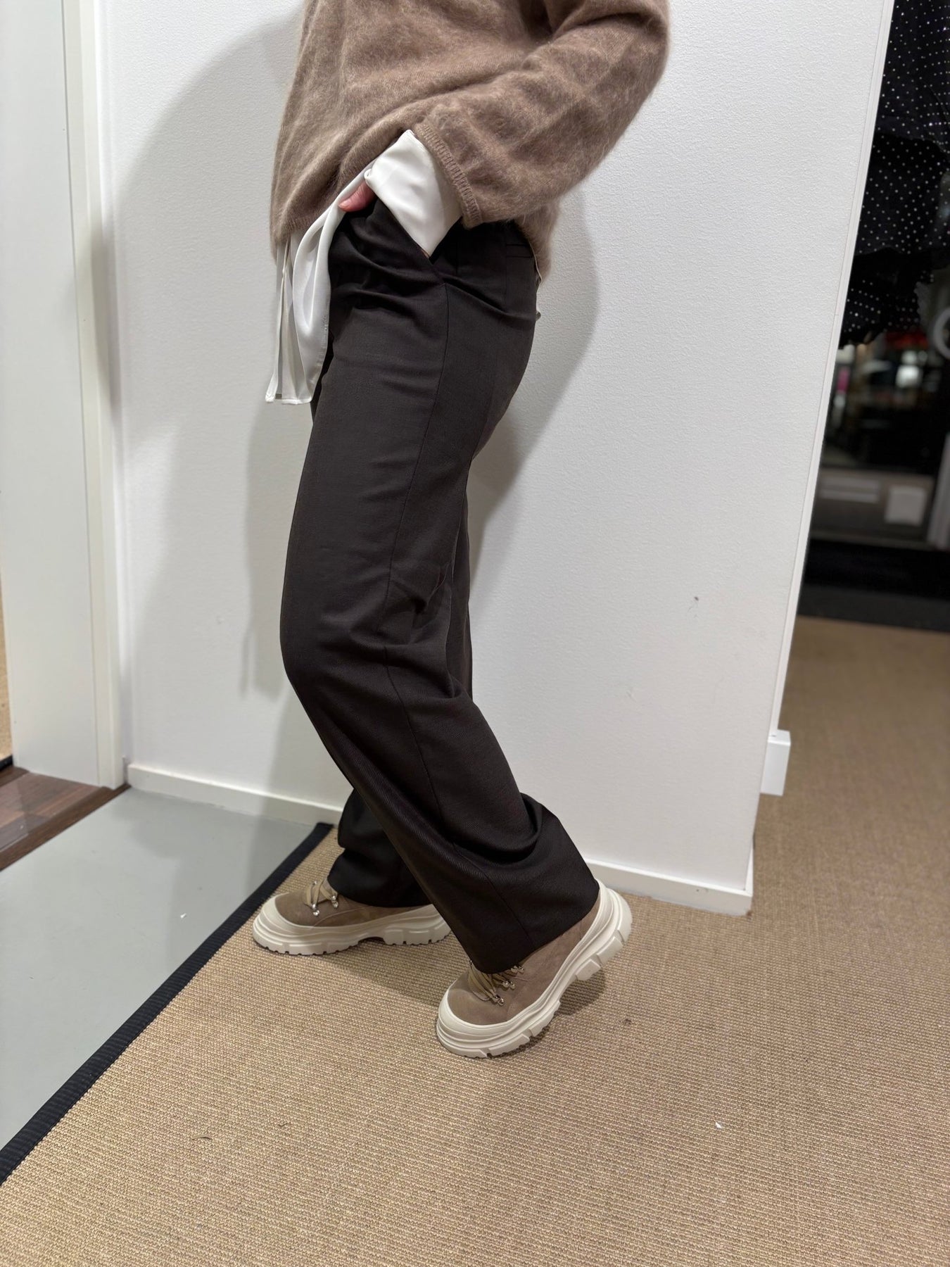 Modernit ja elegantit Elyssa-housut hurmaavat pehmeällä villasekoitteellaan ja tyylikkäällä istuvuudellaan. Chocolate melange -sävy tuo lämpöä ja syvyyttä talviseen pukeutumiseen. Tässä mallissa yhdistyy ajaton tyyli ja mukavuus: villakangas tuntuu miellyttävältä ihoa vasten, ja housujen napakka, mutta joustava leikkaus viimeistelee asukokonaisuuden.
